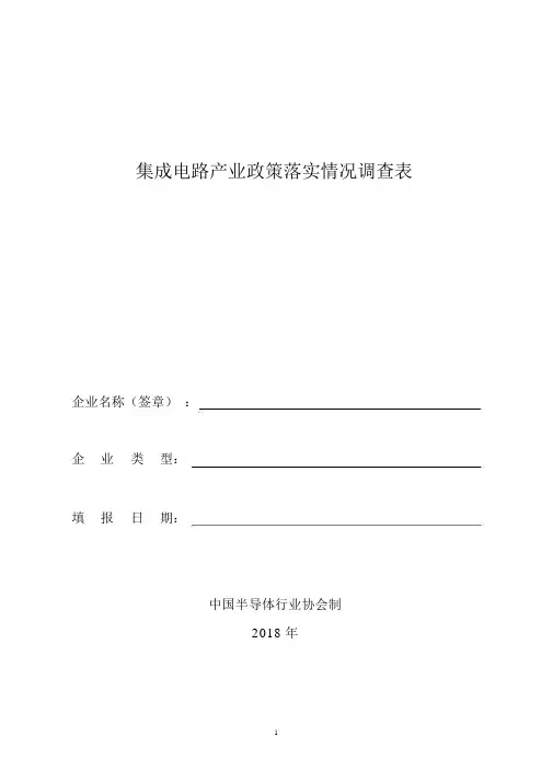 集成电路产业政策落实情况调查表企业名称(签章):企业类型:填报日期:中国半导体行业协会制2018 年填表须知一、依法在中国境内(不含香港、澳门、台湾)注册成立的集成电路设计、制造、封测、设备、材料企业。