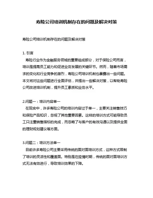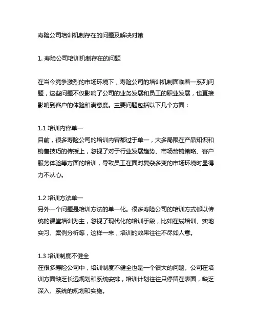 寿险公司培训机制存在的问题及解决对策1. 寿险公司培训机制存在的问题在当今竞争激烈的市场环境下,寿险公司的培训机制面临着一系列问题,这些问题不仅影响了公司的业务发展和员工的职业发展,也直接影响到客户的体验和满意度。