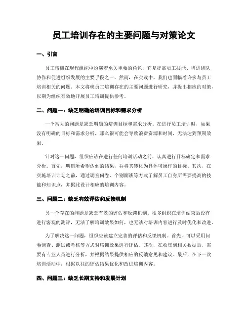 员工培训存在的主要问题及对策论文员工培训存在的主要问题及对策在现代企业管理中,员工培训被认为是提高组织竞争力和员工个人能力的重要手段之一。