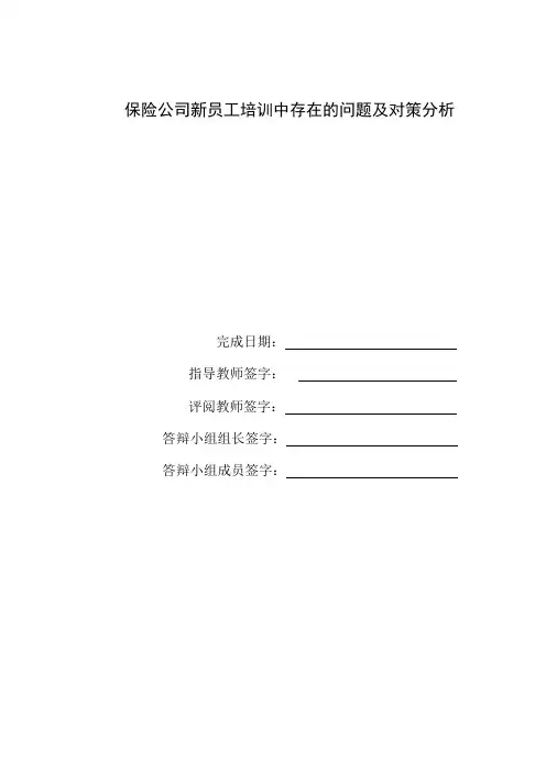 保险公司新员工培训中存在的问题及对策分析完成日期:指导教师签字:评阅教师签字:答辩小组组长签字:答辩小组成员签字:摘要随着社会的深入发展,我国的经济实力不断增强,保险行业也因此得到了前所未有的发展。