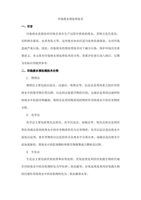 印染废水预处理技术一、引言印染废水是指纺织印染企业在生产过程中排放的废水,其特点是色度高、有机物含量高、水质变化大等。