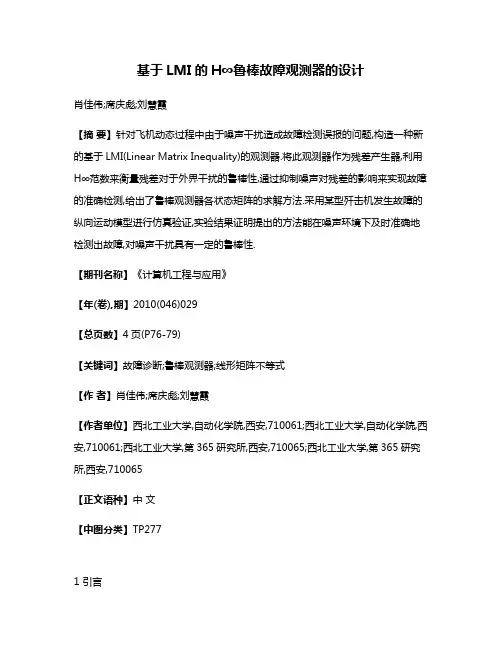 基于LMI的H∞鲁棒故障观测器的设计肖佳伟;席庆彪;刘慧霞【摘要】针对飞机动态过程中由于噪声干扰造成故障检测误报的问题,构造一种新的基于LMI(Linear Matrix Inequality)的观测器.将此观测器作为残差产生器,利用H∞范数来衡量残差对于外界干扰的鲁棒性,通过抑制噪声对残差的影响来实现故障的准确检测,给出了鲁棒观测器各状态矩阵的求解方法.采用某型歼击机发生故障的纵向运动模型进行仿真验证,实验结果证明提出的方法能在噪声环境下及时准确地检测出故障,对噪声干扰具有一定的鲁棒性.【期刊名称】《计算机工程与应用》【年(卷),期】2010(046)029【总页数】4页(P76-79)【关键词】故障诊断;鲁棒观测器;线形矩阵不等式【作者】肖佳伟;席庆彪;刘慧霞【作者单位】西北工业大学,自动化学院,西安,710061;西北工业大学,自动化学院,西安,710061;西北工业大学,第365研究所,西安,710065;西北工业大学,第365研究所,西安,710065【正文语种】中文【中图分类】TP2771 引言在飞机飞行过程中,执行机构的突然卡死、舵面因断裂而产生的部分/完全损伤等故障都会对系统造成突发的控制偏差,致使系统性能下降甚至会导致损毁事故。