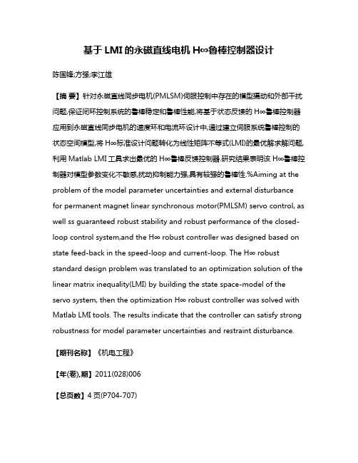 基于LMI的永磁直线电机H∞鲁棒控制器设计陈国锋;方强;李江雄【摘要】针对永磁直线同步电机(PMLSM)伺服控制中存在的模型摄动和外部干扰问题,保证闭环控制系统的鲁棒稳定和鲁棒性能,将基于状态反馈的H∞鲁棒控制器应用到永磁直线同步电机的速度环和电流环设计中,通过建立伺服系统鲁棒控制的状态空间模型,将H∞标准设计问题转化为线性矩阵不等式(LMI)的最优解求解问题,利用Matlab LMI工具求出最优的H∞鲁棒反馈控制器.研究结果表明该H∞鲁棒控制器对模型参数变化不敏感,扰动抑制能力强,具有较强的鲁棒性.%Aiming at the problem of the model parameter uncertainties and external disturbance for permanent magnet linear synchronous motor(PMLSM) servo control, as well ss guaranteed robust stability and robust performance of the closed-loop control system,and the H∞ robust controller was designed based on state feed-back in the speed-loop and current-loop. The H∞ robust standard design problem was translated to an optimization solution of the linear matrix inequality(LMI) by building the state space-model of the servo system, then the optimization H∞ robust controller was solved with Matlab LMI tools. The results indicate that the controller can satisfy strong robustness for model parameter uncertainties and restraint disturbance.【期刊名称】《机电工程》【年(卷),期】2011(028)006【总页数】4页(P704-707)【关键词】永磁直线同步电机;线性矩阵不等式;H∞鲁棒控制【作者】陈国锋;方强;李江雄【作者单位】浙江大学,机械工程学系,浙江杭州310027;浙江大学,机械工程学系,浙江杭州310027;浙江大学,机械工程学系,浙江杭州310027【正文语种】中文【中图分类】TP273;TH390 引言直线电机采用直接驱动方式,具有响应速度快,灵敏度高,且永磁直线电机的定子永磁体采用模块化设计,定子长度可以无限增加。