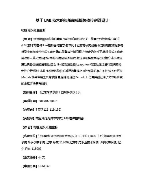 基于LMI技术的船舶舵减摇鲁棒控制器设计杨鹤;程权成;崔宝影【摘要】针对船舶舵减摇的鲁棒H∞控制问题,研究了一种基于线性矩阵不等式(LMI)技术的鲁棒H∞控制器构建方法.不同于已有的研究成果,假定船舶舵减摇系统模型中存在线性分式不确定摄动,即鲁棒控制问题.在特定的条件下,线性分式不确定摄动可以转化为范数有界的不确定摄动,因此,假定系统模型中存在线性分式不确定摄动具备更强的通用性.结合H∞控制理论和Lyapunov稳定性理论进行系统的稳定性分析,通过LMI技术描述船舶舵减摇的鲁棒H∞控制器的存在条件,该条件可被Matlab软件专用工具箱求解.最后结论,通过Simulink仿真实验证明了文章所研究的求解方法是有效的.【期刊名称】《辽东学院学报(自然科学版)》【年(卷),期】2019(026)002【总页数】5页(P116-119,152)【关键词】减摇;线性矩阵不等式(LMI);鲁棒控制器【作者】杨鹤;程权成;崔宝影【作者单位】辽东学院现代教育技术中心, 辽宁丹东 118001;辽宁机电职业技术学院华孚仪表学院, 辽宁丹东 118009;辽宁机电职业技术学院华孚仪表学院, 辽宁丹东 118009【正文语种】中文【中图分类】U661.32船舶在海面航行时,容易受到海浪的影响,导致船舶经常产生剧烈的横摇运动,给船舶行驶的速度、稳定性以及安全等方面带来诸多不利影响。