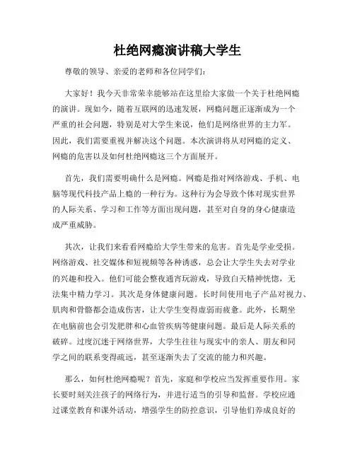 杜绝网瘾演讲稿大学生尊敬的领导、亲爱的老师和各位同学们:大家好!我今天非常荣幸能够站在这里给大家做一个关于杜绝网瘾的演讲。