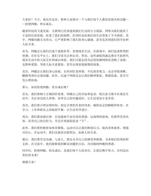 大家好!今天,我站在这里,想和大家探讨一个与我们每个人都息息相关的话题——拒绝网瘾,快乐成长。
