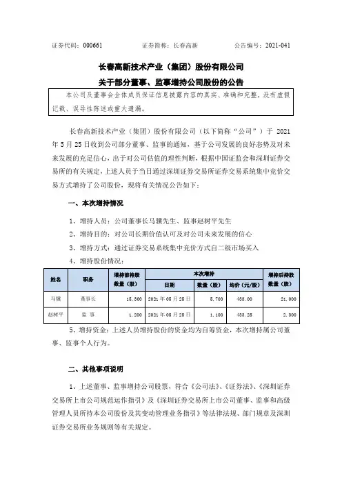 证券代码:000661 证券简称:长春高新公告编号:2021-041长春高新技术产业(集团)股份有限公司关于部分董事、监事增持公司股份的公告长春高新技术产业(集团)股份有限公司(以下简称“公司”)于2021年5月25日收到公司部分董事、监事的通知,基于公司发展的良好态势及对未来发展的充足信心,出于对公司估值的理性判断,根据中国证监会和深圳证券交易所的有关规定,上述人员于当日通过深圳证券交易所证券交易系统集中竞价交易方式增持了公司股份,现将有关情况公告如下:一、本次增持情况1、增持人员:公司董事长马骥先生、监事赵树平先生2、增持目的:对公司长期价值认可及对公司未来发展的信心3、增持方式:通过证券交易系统集中竞价方式自二级市场买入4、增持股份情况:5、增持资金:上述人员增持股份的资金均为自筹资金,本次增持属公司董事、监事个人行为。