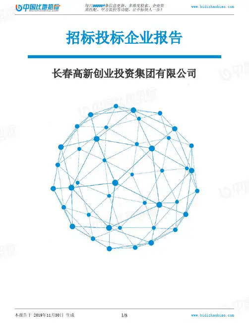 目录一、企业背景 (5)1.1 工商信息 (5)1.2 分支机构 (5)1.3 变更记录 (5)1.4 主要人员 (6)1.5 联系方式 (7)二、股东信息 (7)三、对外投资信息 (8)四、企业年报 (8)五、重点关注 (10)5.1 被执行人 (10)5.2 失信信息 (10)5.3 裁判文书 (10)5.4 法院公告 (10)5.5 行政处罚 (10)5.6 严重违法 (11)5.7 股权出质 (11)5.8 动产抵押 (11)5.9 开庭公告 (11)5.11 股权冻结 (11)5.12 清算信息 (11)5.13 公示催告 (11)六、知识产权 (12)6.1 商标信息 (12)6.2 专利信息 (12)6.3 软件著作权 (12)6.4 作品著作权 (12)6.5 网站备案 (12)七、企业发展 (12)7.1 融资信息 (12)7.2 核心成员 (13)7.3 竞品信息 (13)7.4 企业品牌项目 (13)八、经营状况 (13)8.1 招投标 (13)8.2 税务评级 (14)8.3 资质证书 (14)8.4 抽查检查 (14)8.5 进出口信用 (14)8.6 行政许可 (14)一、企业背景1.1 工商信息企业名称:长春净月高新技术产业开发区科创投资有限公司工商注册号:220109MA17GK2D6统一信用代码:91220109MA17GK2D6C法定代表人:王家福组织机构代码:MA17GK2D-6企业类型:其他有限责任公司所属行业:商务服务业经营状态:开业注册资本:16,000万(元)注册时间:2020-04-23注册地址:长春市净月开发区明宇金融广场A2栋27楼营业期限:2020-04-23 至无固定期限经营范围:以自有资金对相关项目投资(不得从事吸收存款、发放贷款、受托发放贷款、代客理财、融资担保等服务业务,严禁非法集);企业管理服务,产业园区投资、建设、运营和管理,房地产开发,基础设施投资建设及管理,市政公用工程、建筑工程设计、施工,自有房屋租赁,物业管理与服务。