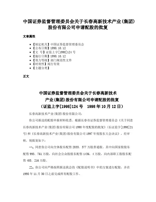(证监上字[1998]124号1998年10月12日)长春高新技术产业(集团)股份有限公司: