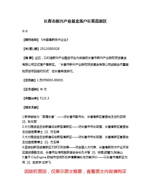 【摘要】近日,以打造新兴产业融资平台为宗旨的长春市新兴产业股权投资基金有限公司正式落户高新区。