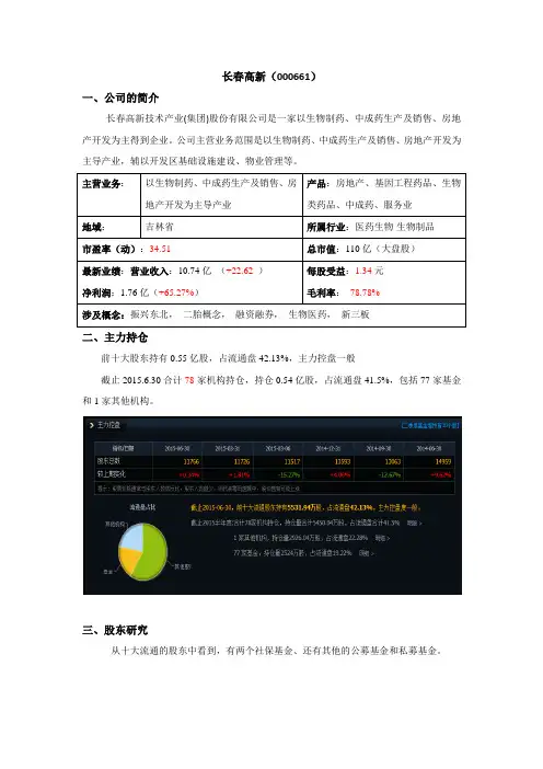长春高新(000661)一、公司的简介长春高新技术产业(集团)股份有限公司是一家以生物制药、中成药生产及销售、房地产开发为主得到企业。