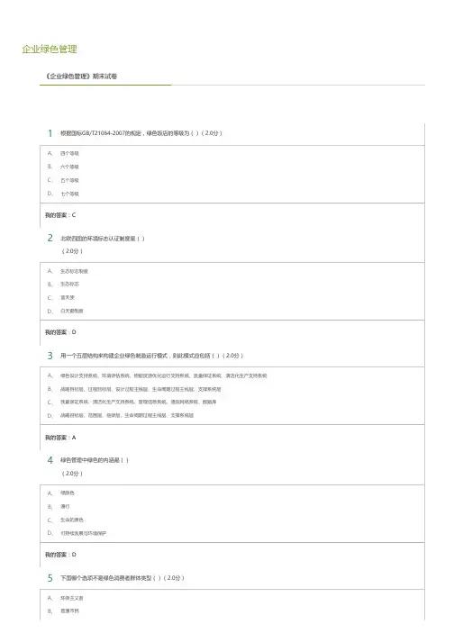 我的答案:√ 得分: 33.4 分知识点 4 企业实施绿色管理的内在动因已完成成绩: 66.7 分1【单选题】GREEN IS GREEN 是哪个公司的绿色口号()A、GMB、GEC、IBMD、P&G我的答案:B 得分: 33.3 分2【单选题】哈特 1995 年在基于自然资源为基础的企业观一文中提出了()A、环境经济学B、战略管理C、自然资源基础观D、可持续发展我的答案:D 得分: 0.0 分3【判断题】企业绿色管理可以帮助企业构建竞争能力,进而为企业带来竞争优势。