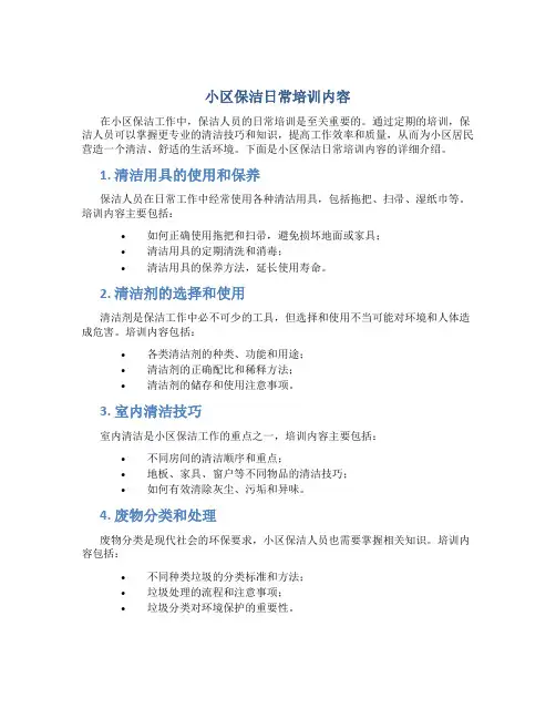 3. 室内清洁技巧室内清洁是小区保洁工作的重点之一,培训内容主要包括:•不同房间的清洁顺序和重点;•地板、家具、窗户等不同物品的清洁技巧;•如何有效清除灰尘、污垢和异味。