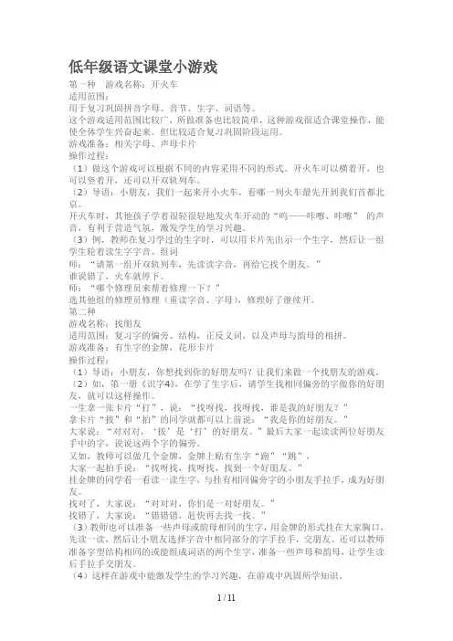 低年级语文课堂小游戏第一种游戏名称:开火车适用范围:用于复习巩固拼音字母、音节、生字、词语等。
