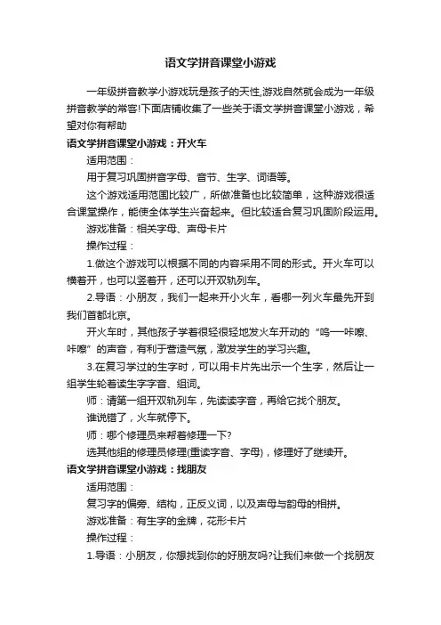 语文学拼音课堂小游戏一年级拼音教学小游戏玩是孩子的天性,游戏自然就会成为一年级拼音教学的常客!下面店铺收集了一些关于语文学拼音课堂小游戏,希望对你有帮助语文学拼音课堂小游戏:开火车适用范围:用于复习巩固拼音字母、音节、生字、词语等。