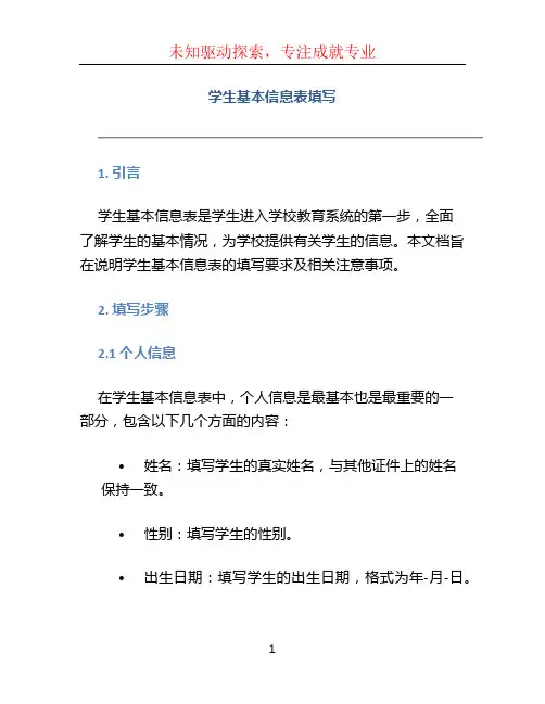 学生基本信息表填写1. 引言学生基本信息表是学生进入学校教育系统的第一步,全面了解学生的基本情况,为学校提供有关学生的信息。