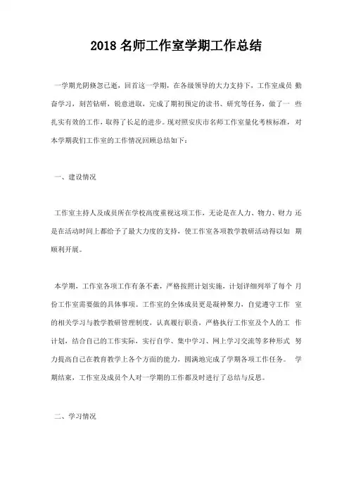 2018名师工作室学期工作总结一学期光阴倏忽已逝,回首这一学期,在各级领导的大力支持下,工作室成员勤奋学习,刻苦钻研,锐意进取,完成了期初预定的读书、研究等任务,做了一些扎实有效的工作,取得了长足的进步。