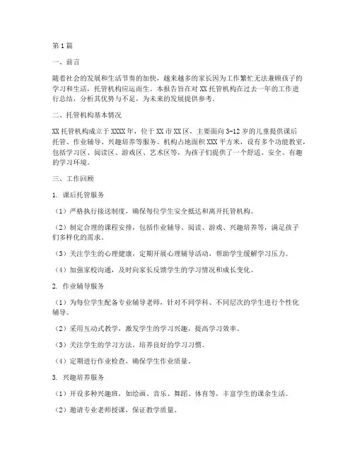 第1篇一、前言随着社会的发展和生活节奏的加快,越来越多的家长因为工作繁忙无法兼顾孩子的学习和生活,托管机构应运而生。