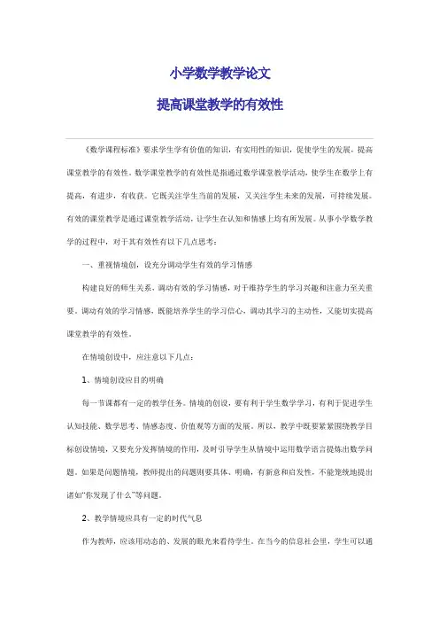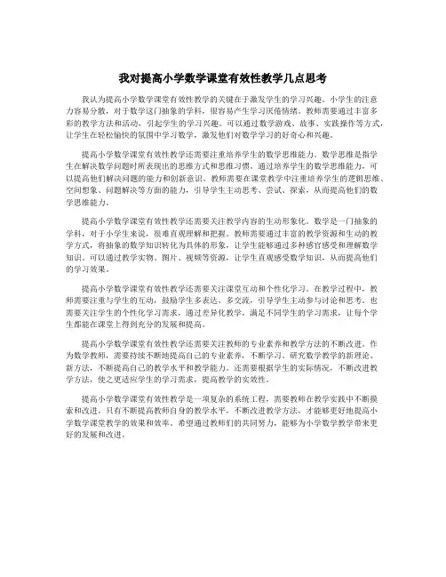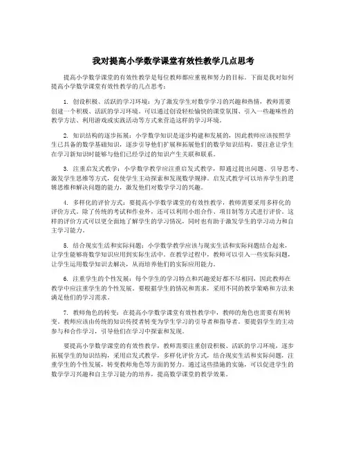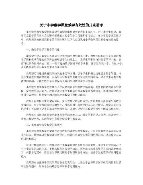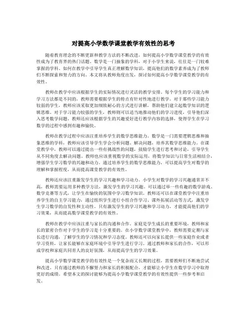 下面是我对如何提高小学数学课堂有效性教学的几点思考:1. 创设积极、活跃的学习环境:为了激发学生对数学学习的兴趣和热情,教师需要创建一个积极、活跃的学习环境。