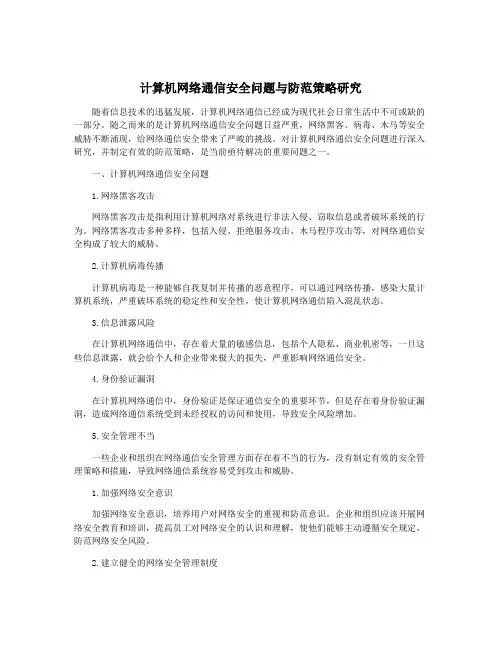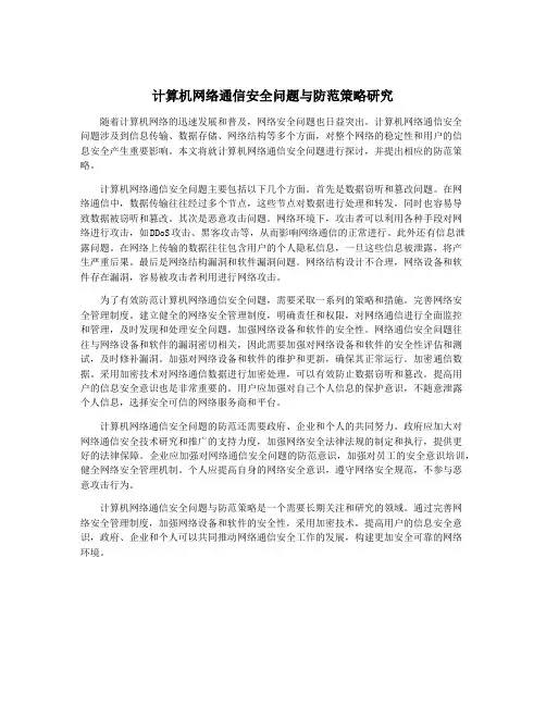 计算机网络通信安全问题与防范策略研究随着计算机网络的迅速发展和普及,网络安全问题也日益突出。