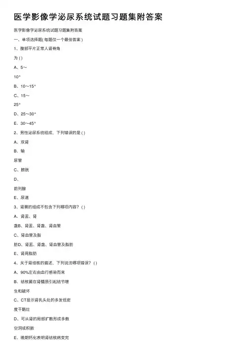 医学影像学泌尿系统试题习题集附答案医学影像学泌尿系统试题习题集附答案⼀、单项选择题( 每题仅⼀个最佳答案 )1、腹部平⽚正常⼈肾脊⾓为 ( )A、5~10°B、10~15°C、15~25°D、25~30°E、30~45°2、男性泌尿系统组成,下列错误的是 ( )A、双肾B、输尿管C、膀胱D、前列腺E、尿道3、肾窦的组成不包含下列哪项内容? ( )A、肾盂、肾盏B、肾盂、肾盏、肾⾎管C、肾⾎管及脂肪D、肾盂、肾盏、肾⾎管及脂肪E、肾周脂肪4、关于肾结核的描述,下列说法哪项错误? ( )A、90%左右由⾎⾏感染⽽来B、结核菌在肾髓质引起结节增⽣和破坏C、CT显⽰肾乳头处的多发低密度⼲酪灶D、可从肾的局部扩散形成多数空洞或积脓E、晚期钙化表明肾结核病变完全愈合5、尿路结⽯最常⽤的检查⽅法是 ( )A、B超检查B、腹部平⽚检查C、腹部CT检查D、MRUE、逆⾏尿路造影检查6、以下哪种声像图最易诊断为肾积⽔ ( )A、肾盂、肾盏集合系统充满⽆回声B、肾盂、肾盏集合系统回声增强C、肾失常扭曲D、肾实质多发⽆回声E、肾盂内局限性⾼张囊性⽆回声7、腹部正位⽚发现右上腹⼀圆形致密影,为了进⼀步定位诊断,最简单的⾸选⽅法是 ( )A、B超检查B、侧位腹平⽚检查C、静脉尿路造影检查D、CT检查E、MRI检查8、前列腺增⽣症,尿道可能发⽣的形态改变是A、尿道内⼝移位B、后尿道拉长超过3cmC、后尿道曲度改变D、排尿期尿道腔变细或不规则E、以上均是9、关于CT诊断泌尿系结⽯,下列说法错误的是()A、平扫能确切显⽰阳性结⽯所在位置B、CT不能发现阴性结⽯C、CT可鉴别结⽯、肿瘤和⾎块D、肿瘤CT值约为30-60HuE、⾎块CT值达60-70Hu10、肾癌X线⾎管造影叙述,错误的是()A、⼤多数的肿瘤⾎管丰富B、有明显的动静脉瘘C、肾静脉内有充盈缺损D、可见静脉池E、肾动脉闭塞11、关于单纯性肾囊肿的MRI表现,下列说法错误的是()A、边缘光滑B、信号均匀C、T1WI呈低信号D、T2WI呈⾼信号E、增强后明显强化12、男,27岁,根据所⽰图像,最可能的诊断是()A、盆腔肾B、腰段肾C、胸内肾D、肾下垂E、游⾛肾13、鉴别肾癌与弧⽴性肾囊肿,哪种X线检查⽅法最好?()A、静脉肾盂造影B、腹膜后充⽓造影C、肾动脉造影D、断层摄影E、逆⾏肾盂造影14、患者,⼥,54岁,⾎尿1年余,右腰痛10天余,CT⽰右肾下极60mm×70mm肿块,突出肾外,中⼼有不规则低密度区,增强扫描早期病灶明显强化,中⼼低密度区⽆强化。