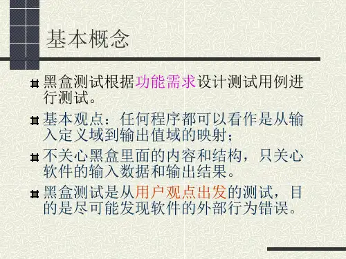 黑盒测试(Black-Box Testing),指的是把被 测得软件看做一个黑盒子,我们不关心盒子里 面的结构是什么样子的,只关心软件的输入数 据和输出结果,黑盒测试也称为功能测试,它 包括功能测试和性能测试。