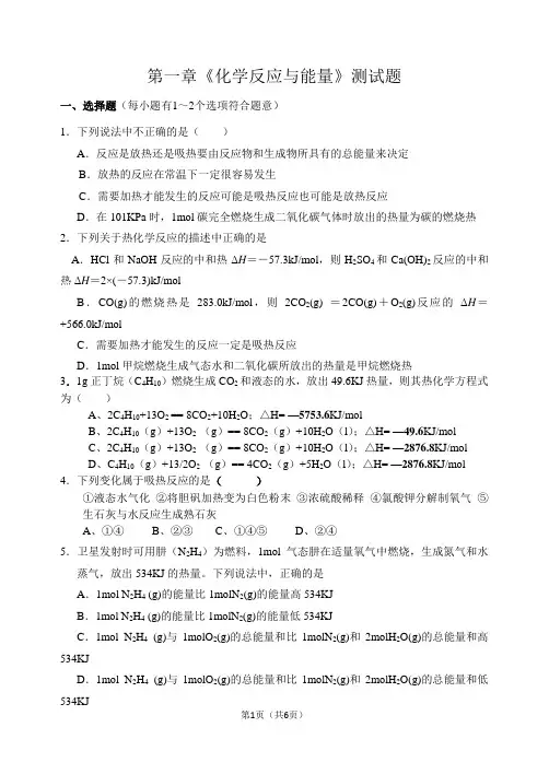 第一章《化学反应与能量》测试题一、选择题(每小题有1~2个选项符合题意)1.下列说法中不正确的是()A.反应是放热还是吸热要由反应物和生成物所具有的总能量来决定B.放热的反应在常温下一定很容易发生C.需要加热才能发生的反应可能是吸热反应也可能是放热反应D.在101KPa时,1mol碳完全燃烧生成二氧化碳气体时放出的热量为碳的燃烧热2.下列关于热化学反应的描述中正确的是A.HCl和NaOH反应的中和热ΔH=-57.3kJ/mol,则H2SO4和Ca(OH)2反应的中和热ΔH=2×(-57.3)kJ/molB.CO(g)的燃烧热是283.0kJ/mol,则2CO2(g) =2CO(g)+O2(g)反应的ΔH=+566.0kJ/molC.需要加热才能发生的反应一定是吸热反应D.1mol甲烷燃烧生成气态水和二氧化碳所放出的热量是甲烷燃烧热3.1g正丁烷(C4H10)燃烧生成CO2和液态的水,放出49.6KJ热量,则其热化学方程式为()A、2C4H10+13O2 == 8CO2+10H2O;△H= —5753.6KJ/molB、2C4H10(g)+13O2 (g)== 8CO2(g)+10H2O(l);△H= —49.6KJ/molC、2C4H10(g)+13O2 (g)== 8CO2(g)+10H2O(l);△H= —2876.8KJ/molD、C4H10(g)+13/2O2 (g)== 4CO2(g)+5H2O(l);△H= —2876.8KJ/mol 4.下列变化属于吸热反应的是()①液态水气化②将胆矾加热变为白色粉末③浓硫酸稀释④氯酸钾分解制氧气⑤生石灰与水反应生成熟石灰A、①④B、②③C、①④⑤D、②④5.卫星发射时可用肼(N2H4)为燃料,1mol气态肼在适量氧气中燃烧,生成氮气和水蒸气,放出534KJ的热量。