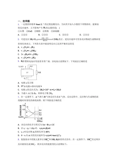 一、选择题1.一定量的锌粉和6mol·L-1的过量盐酸反应,当向其中加入少量的下列物质时,能够加快反应速率,又不影响产生H2的总量的是( )①石墨②CuO ③铜粉④铁粉⑤浓硫酸A.①②④B.①③⑤C.③④⑤D.①③④2.可逆反应3H2+N2高温、高压催化剂2NH3的正、逆反应速率可用各反应物或生成物浓度的变化来表示,下列各关系中能说明反应已达到平衡状态的是A.v正(N2)=v正(H2)B.v正(N2)=v逆(NH3)C.2v正(H2)=3v逆(NH3)D.v正(N2)=3v逆(H2)3.H2S燃料电池应用前景非常广阔,该电池示意图如下。
