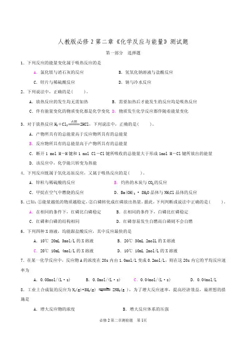 人教版必修2第二章《化学反应与能量》测试题第一部分选择题1.下列反应的能量变化属于吸热反应的是A.氯化铵与消石灰的反应B.氢氧化钠溶液与盐酸反应C.锌片与稀硫酸反应D.钠与冷水反应2.下列说法中,正确的是()。