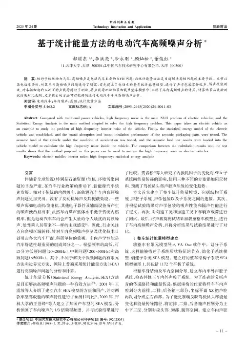 2020年24期创新前沿科技创新与应用Technology Innovation and Application基于统计能量方法的电动汽车高频噪声分析*郝耀东1,2,李洪亮2,冷永刚1,顾灿松2,董俊红2(1.天津大学,天津300354;2.中国汽车技术研究中心有限公司,天津300300)引言伴随着全球能源(特别是石油资源)危机、环境污染问题的日益严重,在汽车行业政策的推动下,新能源汽车快速发展。