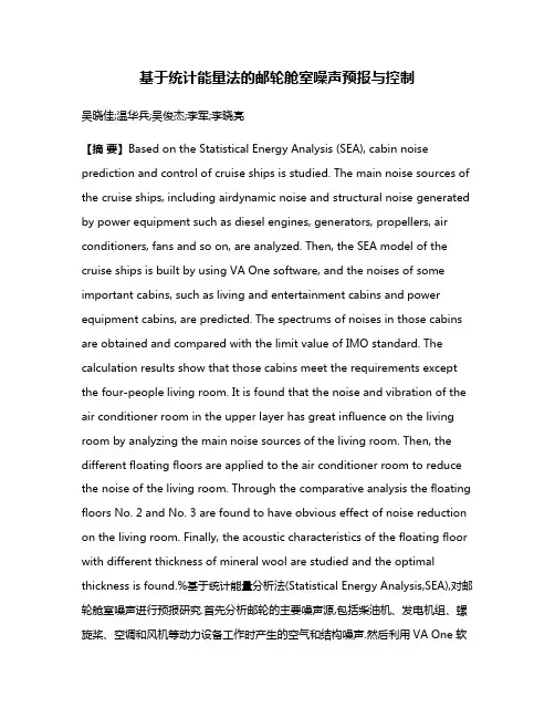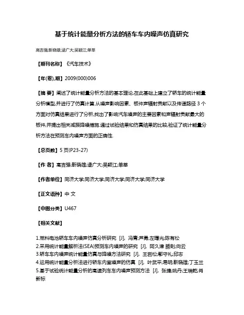 关键词:统计能量分析;损耗因子;噪声控制Abstract: Statistical energy analysis method is widely used to predict the vibration and noise of the complex structure in the high frequency. This paper introduced the basic theory of statistical energy analysis method which has been gradually promoted and has obtained the effective application. Besides, a car interior vehicle SEA model as well as the automobile body subsystem SEA model for high frequency noise analysis has been established by referring to related information. This paper expounds the application of the vehicle noise transfer path analysis method. Finally, he applicability and accuracy of statistical energy analysis in the design of vehicle interior noise performance was verified.Key words: Statistical energy analysis; loss factor; noise control1、引言随着汽车消费市场的需求越来越高和车辆设计技术的发展,车内噪声性能正逐步成为衡量乘用车质量及其档次的重要指标之一,对于高档及豪华车市场尤其如此。