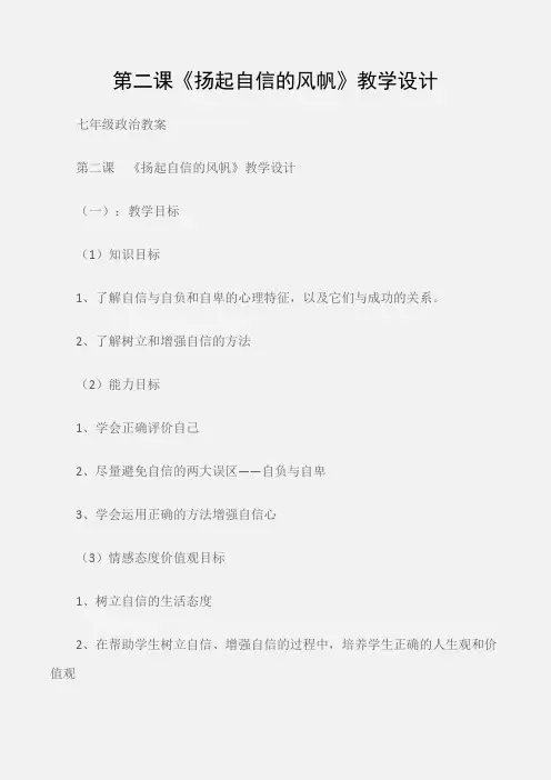 第二课《扬起自信的风帆》教学设计七年级政治教案第二课《扬起自信的风帆》教学设计(一):教学目标(1)知识目标1、了解自信与自负和自卑的心理特征,以及它们与成功的关系。