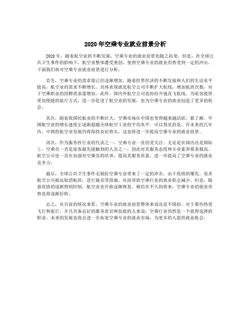 2020年空乘专业就业前景分析【摘要】2020年空乘专业就业前景备受关注,本文通过对空乘行业的发展现状、就业市场需求以及专业培训和能力要求的分析,揭示了2020年空乘专业就业的趋势。