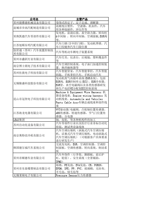 江苏旭顺东明汽配有限公司 汽车门锁(含中控门锁),发动机罩锁,汽车门铰链和汽车门限位器创世通(苏州)汽车装置控制技术有限公司汽车等机动车辆电子装置系统常州市鑫跃灯业有限公司 汽车灯具,仪表台,后视镜,塑料覆盖件等南京博士朗电子技术有限公司 汽车空调控制系统,电子油门加速控制装置,换挡操纵器等苏州佐敦电子科技有限公司 汽车智能管家,汽车智能掌控,汽车智能钥匙,手机掌控汽车,手机启动汽车无锡隆盛科技股份有限公司 发动机废气再循环系统(EGR系统),包括EGR阀,EGR控制单元(ECU),EGR 冷却器,EGR管,真空电磁阀以及各类传感器研发和生产电控VE分配泵ECU控制系统昆山市冠贺电子科技有限公司 Machine & Equipment Wire Harness 机器设备线束,Engine wiring harness 发动机线束,Automobile and Vehicles Parts Cable Assy车辆总成线束和部件线束江苏海龙电器有限公司 VVT驱动器/电磁阀,凸轮轴位置传感器,ABS传感器,转速传感器,节气门位置传感器,分电器LEAX集团 轴, 齿轮, 等各种机构件的加工苏州自动化设备有限公司 汽车零部件行业以及医疗行业非标自动化组装,测试类设备线体南京奥特佳冷机有限公司 汽车空调压缩机(涡旋式汽车空调压缩机,活塞式汽车空调压缩机,电动涡旋式汽车空调压缩机)(可根据客户具体要求进行研发生产)韩国德尔福汽车系统公司 交流发电机,EGR,空调控制器,空调控制面板,空调传感器,转向系统,制动系统常州市顺德车业有限公司 汽车外饰件(行李架,脚踏板,前后护杠,轮眉),安全系统(全景辅助,TPMS)常州市东泰橡塑制品有限公司 海绵,PE发泡,EVA发泡,CR,PORON,EPDM,XPE,PP,PVC,玻璃棉,无纺布,羊毛毡,绿毛毡等无锡莱顿电子有限公司 Pressure Sensor压力传感器欧斯亚精密机械有限公司 五金冲压件 , 电子连接片 , 汽车零部件 , 电器机箱苏州市沃特测试技术服务有限公司检测认证华通电脑(苏州)有限公司 車載摄像头模组,車載GPS模组,.車載LED/LCD模组,车用灯常州贝伦迪电子有限公司 精密注塑件,整车线束,精密机加工,压铸件,表面处理泰兴市永诚车灯塑件有限公司 内外部照明灯,内外饰注塑件,后视镜总成东华汽车实业有限公司 模具及装备,铸锻毛坯,底盘相关系统(传动系统,动力系统,制动系统,转向系统,悬挂系统等),电子仪表及饰件配件苏州正盛科技有限公司 塑胶制品,电子连接器等维尔斯电子(昆山)有限公司 精冲模,精密型腔模,模具标准件,新型仪表元器件和材料,电线,电缆,电器配件苏州爱知高斯电机有限公司 空调压缩机马达,驱动电机马达和变频器华为技术有限公司 通信网络中的交换网络,传输网络,无线及有线固定接入网络和数据通信网络及无线终端产品常州特耐万利达电子有限公司 继电器铁芯,工程塑料成型,金属冲压制品(包括冷挤压件),五金精加工(包括数控加工),小电器部品等苏州爱普拉斯微电子有限公司 电磁阀线圈,传感器线圈,天线线圈无锡莱顿电子有限公司 变速箱压力传感器,发动机压力传感器,动力转向传感器,差压传感器,盛威尔(南通)电装科技有限公司线束昆山骏鼎达电子科技有限公司 主营汽车线束,汽车胶管保护套管,如编织网管,热收缩布,波纹管,玻纤管,热缩管及发动机耐高温套管等产品海安联科汽车零部件有限公司 Power Window Motor 玻璃升降器电机,天窗电机,座椅电机等张家港孚冈汽车部件有限公司中央闭锁器,后行李箱开启机构,后视镜启动机构,油箱开启机构等南京富道电子科技有限公司 汽车中控面板,车门车窗控制器,商用车中央控制器等张家港乐达汽车电器有限公司 客车电子仪表,客车CAN 总线仪表,汽车电器开关,传感器,电子钟,公交车电脑报站器,电子路牌,车内外LED 显示屏,投币机,倒车监视器等张家港华显光电有限公司 液晶显示器(LCD)和液晶显示模块(LCM)丹阳金城配件有限公司 汽车和摩托车灯具,汽车智能天窗,保险杠,面罩,支架,挡泥板,遮阳板,翼子板,汽车内外装饰件江苏亨通电子线缆科技有限公司 汽车电线,特种电线江苏利得尔电机有限公司 变频调速电机,通风机专用耐高温电机,冷却塔专用电机,电磁制动电机,压缩机专用电机爱德克斯(常州)管理有限公司 控 制制动器,两轮车用制动系统,基础制动器包括助力器&主缸总成,盘式制动器,制动器卡钳,盘式/鼓式制动器,摩擦块,驻车制动器,电子驻车制动 器,后盘带鼓式制动器(DIH),复式比例阀,感载比例阀。