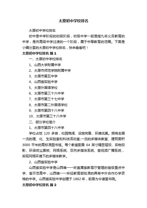 下面是小编分享的太原初中学校排名,快来看看吧!太原初中学校排名篇1一、太原初中学校排名1、山西大学附属中学2、太原市师范学院附属中学3、太原市第五中学4、山西省实验中学5、太原外国语学校6、太原市第三十六中学7、太原市第三十七中学8、太原市第二外国语学校9、太原市第四十八中学10、太原市第三十八中学二、部分学校简介1、太原市第四十八中学学校占地120多亩,校园宽阔、设施完备、环境优美。