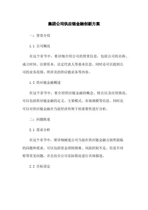集团公司供应链金融创新方案一:背景介绍1.1 公司概况在这个章节中,要详细介绍公司的背景信息,包括公司的名称、成立时间、注册资本、法定代表人等基本信息。