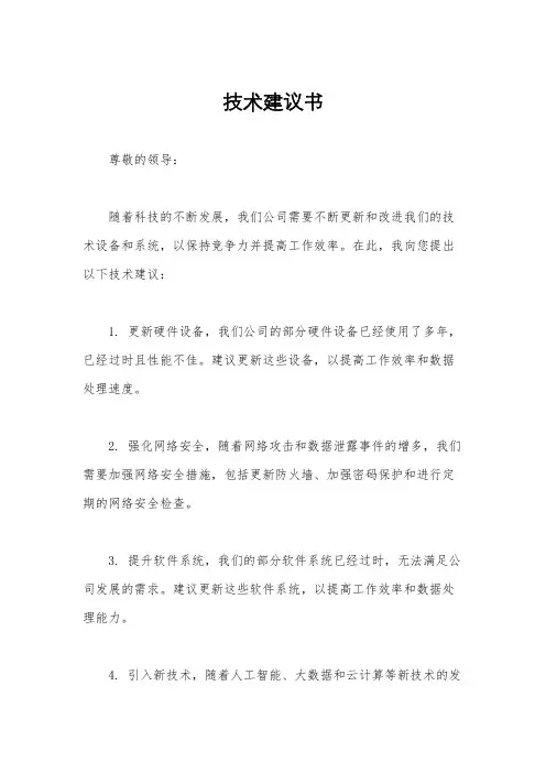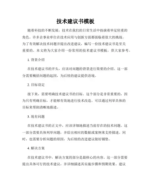 技术建议书模板随着科技的不断发展,技术在我们的日常生活中扮演着举足轻重的角色。