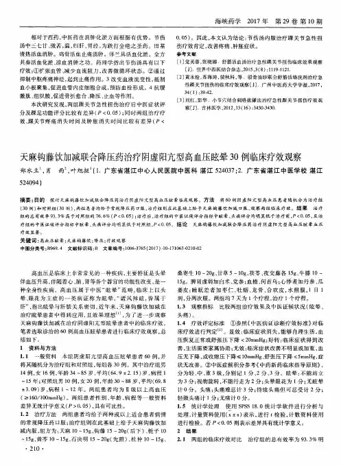 天麻钩藤饮加味治疗高血压合并焦虑状态30例【摘要】目的:观察天麻钩藤饮加味治疗高血压合并焦虑状态临床疗效。