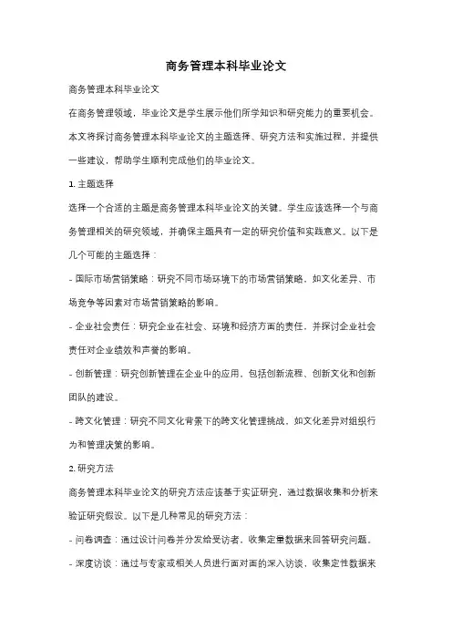 1. 主题选择选择一个合适的主题是商务管理本科毕业论文的关键。