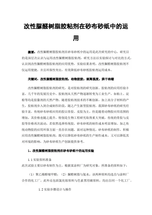 1、改性脲醛树脂胶粘剂在砂布砂纸中的运用实验1.1实验原料准备此次试验主要以砂布制作为主,根据某涂料厂为研究对象,所准备的原料如下:(1)聚乙烯醇缩甲醛;(2)脲醛树脂与氨水,该两种原料均选自与涂料厂合作的化工厂,此外还包括氯化铵原料与色素黑用碳原料,均出自同一个化工厂。