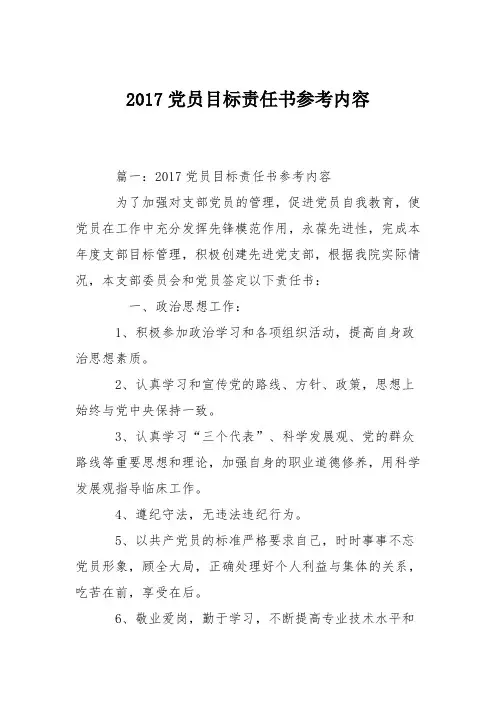 2017党员目标责任书参考内容篇一:2017党员目标责任书参考内容为了加强对支部党员的管理,促进党员自我教育,使党员在工作中充分发挥先锋模范作用,永葆先进性,完成本年度支部目标管理,积极创建先进党支部,根据我院实际情况,本支部委员会和党员签定以下责任书:一、政治思想工作:1、积极参加政治学习和各项组织活动,提高自身政治思想素质。
