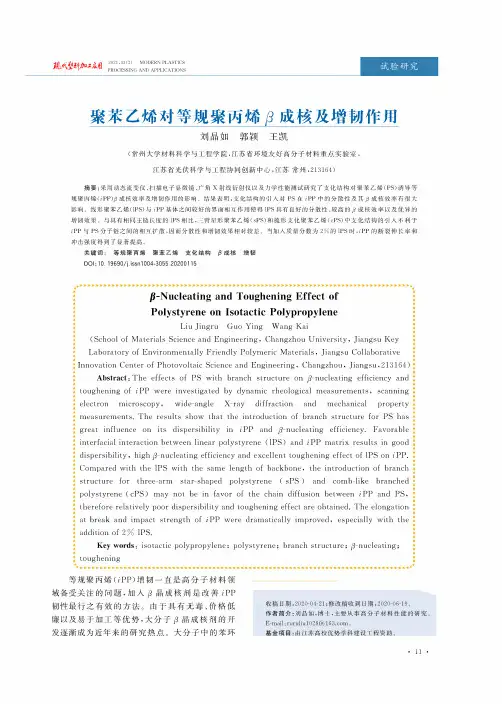 当加入质量分数为2%的IPS时!PP的断裂伸长率和冲击强度得到了显著提高&关键词:等规聚丙烯聚苯乙烯支化结构Q成核增韧DOI:10.19690/j.issn1004-3055.20200115/--Nucleating and Toughening Effect ofA VPolystyrene on Isotactic Polypropylene;A VLiu Jingru Guo Ying Wang Kaia v(School of Materials Science and Engineering,Changzhou University,Jiangsu Key \Laboratory of Environmentally Friendly Polymeric Materials,Jiangsu Collaborative JA VInnovation Center of Photovoltaic Science and Engineering,Changzhou,Jiangsu,213164) *v :Abstract:The effects of PS with branch structure on/^-nucleating efficiency anda v;toughening of&PP were investigated by dynamic rheological measurements,scanning:a velectron microscopy,wide-angle X-ray diffraction and mechanical property jj measurements.The results show that the introduction of branch structure f or PS has J great influence on i ts dispersibility in&PP and仔-nucleating efficiency.Favorable:a vjj interfacial interaction between linear polystyrene(IPS)and&PP matrix results in gooda v;dispersibility,high仔一nucleating efficiency and excellent toughening effect of IPS on&PP.Compared with the IPS with the same length of backbone,the introduction of branchA Vstructure for three-arm star-shaped polystyrene(sPS)and comb-like branchedA Vpolystyrene(cPS)may not be in favor of the chain diffusion between&PP and PS, \v JJ therefore relatively poor dispersibility and toughening effect are obtained.The elongationa v!!at break and impact strength of&PP were dramatically improved,especially with the additionof2%;PS.A MKey words:isotactic polypropylene%polystyrene;branch structure%/-nucleating;*v toughening等规聚丙烯(PP)增韧一直是高分子材料领域关注的,加入仔核剂是改善&PP性最行之的&无毒、价格低以及加工等,大分子仔核剂的开渐成为近年来的研究热点。