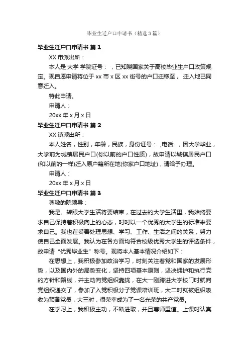 申请人:20xx年x月x日毕业生转户口的申请书范文篇二XXX 派出所:本人XXX,性别男,身份证号是XX大学20XX届毕业学生,由于毕业需迁出学校集体户口(地址:XXX),现申请将户口迁入工作单位集体户口,迁入单位已接受迁入。