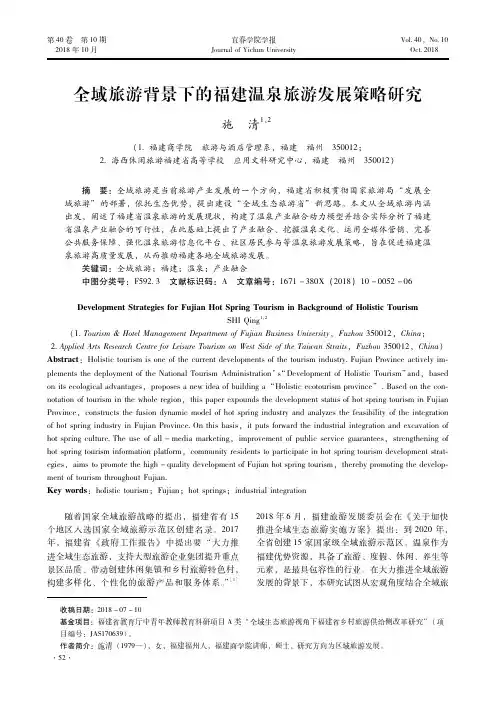 关键词:福州温泉;温泉旅游开发;可持续发展随着我国旅游业向纵深层次发展,旅游、休闲、度假需求急速膨胀,“休闲时代”呼之欲出,集旅游、休闲、健身于一体的温泉旅游消费需求迅猛增长。