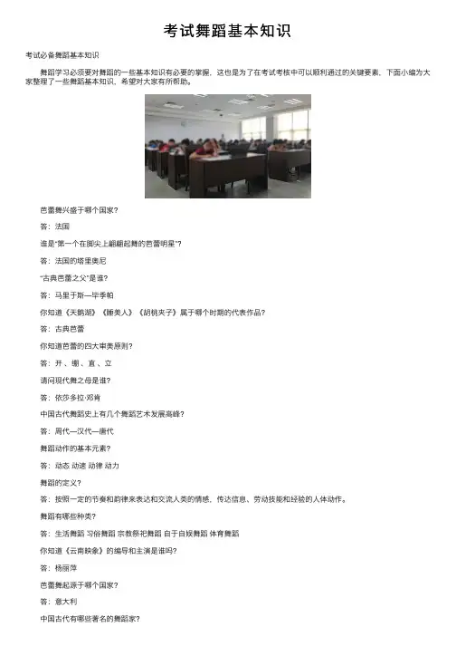 考试舞蹈基本知识考试必备舞蹈基本知识 舞蹈学习必须要对舞蹈的⼀些基本知识有必要的掌握,这也是为了在考试考核中可以顺利通过的关键要素,下⾯⼩编为⼤家整理了⼀些舞蹈基本知识,希望对⼤家有所帮助。
