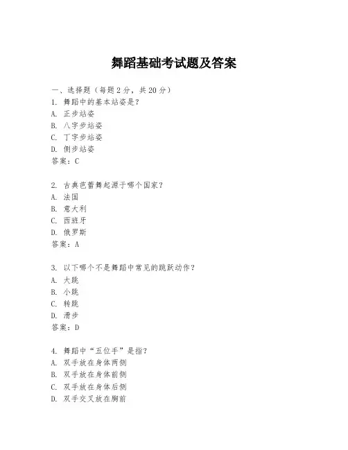 舞蹈基础考试题及答案一、选择题(每题2分,共20分)1. 舞蹈中“五位脚”是指哪两个脚位?A. 第一、二位B. 第二、三位C. 第三、四位D. 第四、五位答案:D2. 芭蕾舞中的基本手位有几个?A. 4个B. 5个C. 6个D. 7个答案:B3. 下列哪个不是中国古典舞的基本手型?A. 兰花指B. 虎口掌C. 剑指D. 拳击手答案:D4. 舞蹈中“小跳”属于哪一类动作?A. 地面动作B. 跳跃动作C. 旋转动作D. 控制动作答案:B5. 舞蹈术语“阿拉贝斯”指的是什么?A. 一种旋转B. 一种跳跃C. 一种平衡D. 一种伸展答案:D6. 舞蹈中“大跳”通常需要几个节拍完成?A. 1个B. 2个C. 3个D. 4个答案:B7. 舞蹈中“平转”是指什么?A. 向前转B. 向后转C. 向旁转D. 原地转答案:C8. 在舞蹈中,“提沉”是指哪个部位的动作?A. 手臂B. 腿部C. 腰部D. 头部答案:C9. 舞蹈中“弓箭步”的后脚应该如何放置?A. 脚尖着地B. 脚跟着地C. 全脚掌着地D. 脚外侧着地答案:B10. 下列哪个不是舞蹈中常见的表情训练?A. 喜B. 怒C. 哀D. 恐答案:D二、填空题(每题2分,共20分)1. 舞蹈中的基本站姿包括_______、_______和_______。