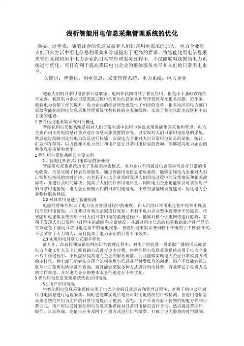 关键词:供电公司;用电采集系统;运行管理引言在近几年当中,电力企业为了顺应社会时代的发展要求,开始逐渐趋向智能化方向,因此对用户的用电信息采集系统提出了更高的要求。
