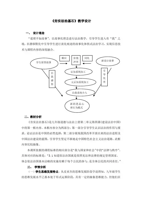 《夯实法治基石》教学设计一、设计理念“道理不如故事”,以故事化理念进行法治教学,引导学生进入有“我”之境,在潜移默化中引导学生进行淡化痕迹的故事化体悟式法治学习,实现信息技术与课程内容的深度融合。