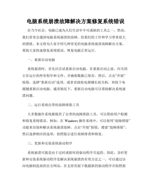 电脑系统崩溃故障解决方案修复系统错误在当今社会,电脑已成为人们生活中不可或缺的工具之一。