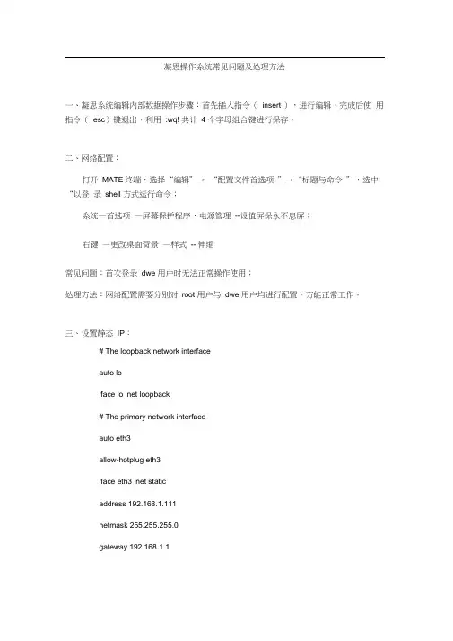 三、设置静态IP:# The loopback network interfaceauto loiface lo inet loopback# The primary network interfaceauto eth3allow-hotplug eth3iface eth3 inet staticaddress 192.168.1.111netmask 255.255.255.0gateway 192.168.1.1常见问题( 1 ):直接输入The loopback network interface 指令无法正常进行设置。